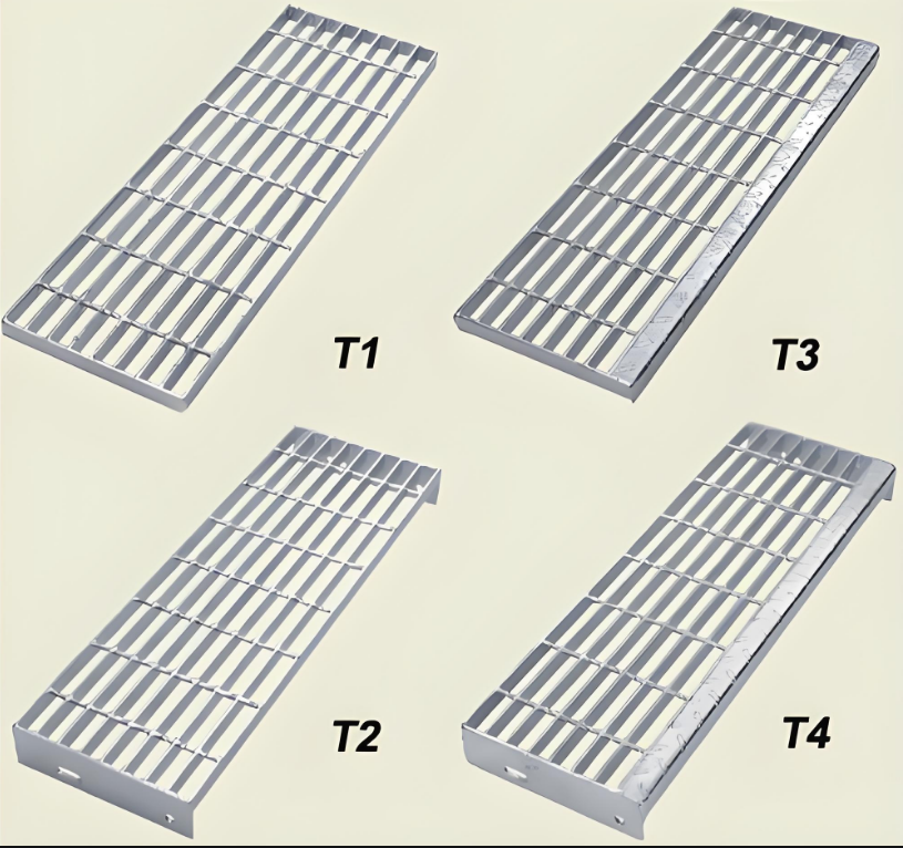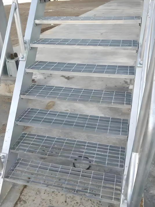 Stepped steel grating (also known as platform step plates) features a grid structure formed by cross-welding flat bars and crossbars. It is primarily used in industrial, municipal, and commercial settings for staircases, walkways, and similar applications.